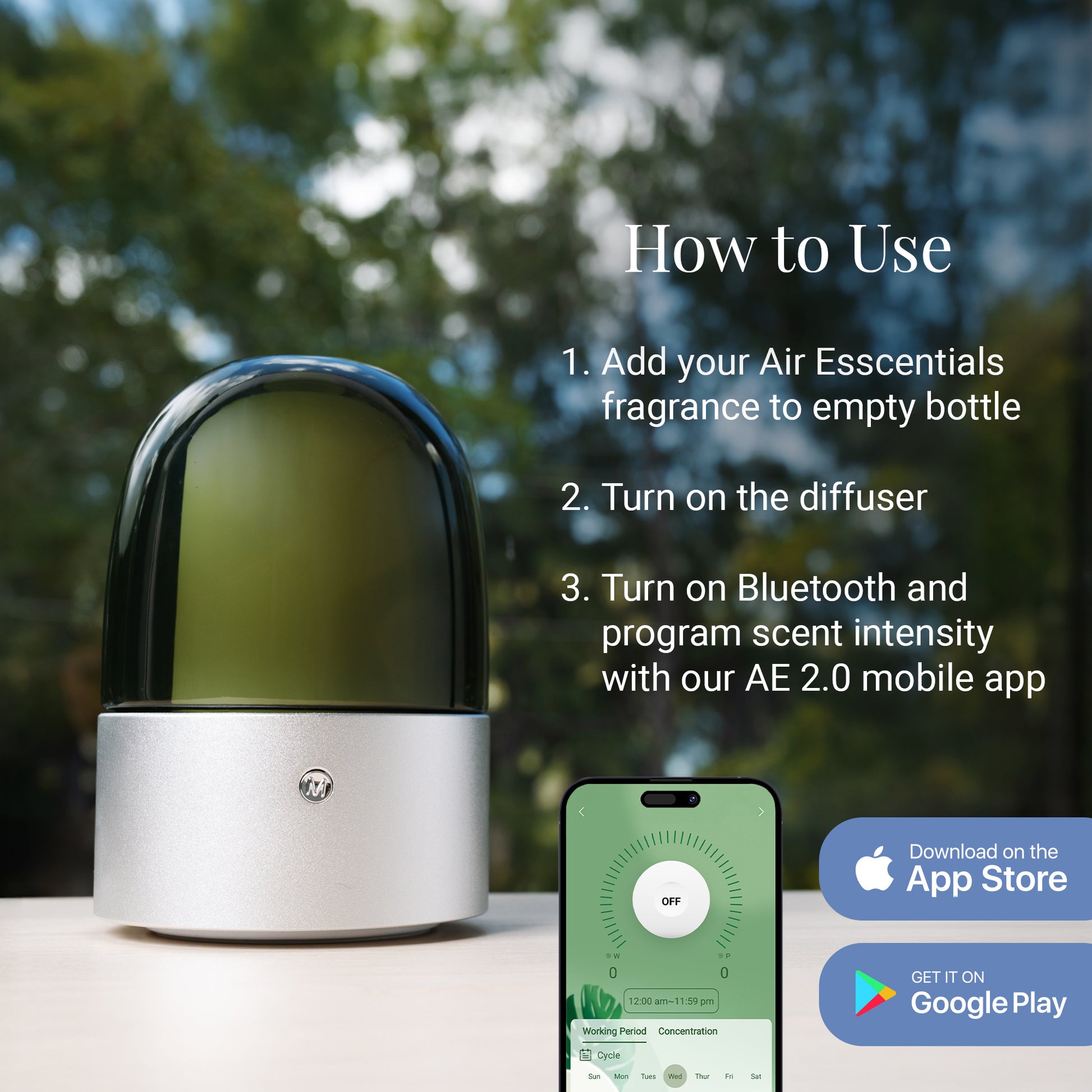 The AE750 is a modern aroma diffuser with Bluetooth Control. This package includes an empty 60mL fragrance bottle.