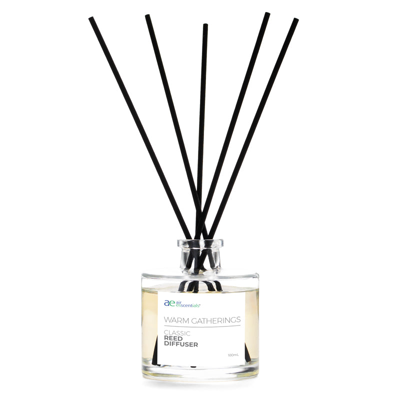 This reed stick diffuser is scented with Warm Gatherings, a light, smoky fragrance which recalls a cozy autumn gathering where warm touches of acorns, amber, and golden incense blend with comforting notes of cashmere and sandalwood.